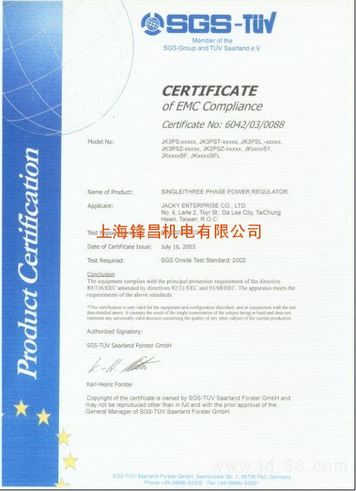證書介紹 臺灣積奇成立于1992年,迄今十八年有余。從事專業(yè)工業(yè)控制已有多年之久,就軟起動器及電力調(diào)整器(可控硅)而言,是臺灣專業(yè)制造生產(chǎn),在臺灣唯一全系列產(chǎn)品獲得CE(歐盟)國際質(zhì)量認證的公司,且深受臺灣上市、上柜公司和各研究院的支持與愛護,另也深受國內(nèi)客戶的愛用.產(chǎn)品全都通過CE、IEC60947-4-2認證合格規(guī)范 ![]() 證書圖片 |