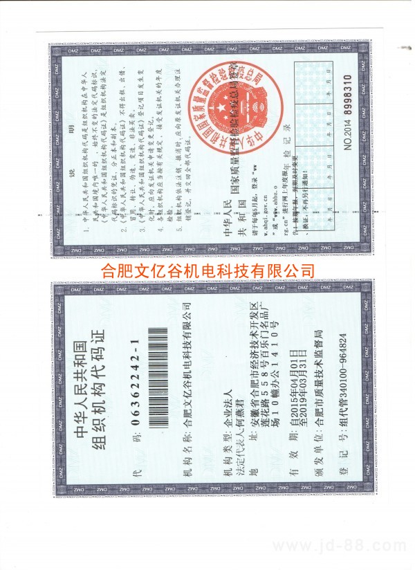 發(fā)證機(jī)構(gòu): | 合肥市質(zhì)量監(jiān)督局 | 發(fā)證時(shí)間 : | 2015-04-01 |