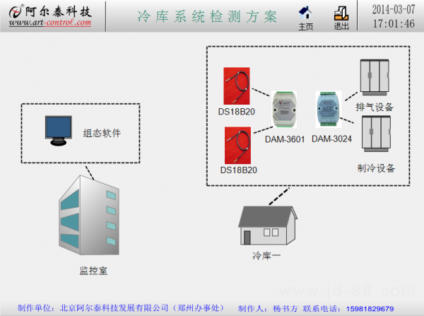 某副食品公司具有多個冷庫,各個冷庫獨立運行,通過計算機將各個冷庫進行統(tǒng)一管理,冷庫系統(tǒng)有各種冷凍配套設備,比如進氣設備,排氣設備,制冷設備,除濕設備以及化霜設備等,通過開關量輸入輸出模塊DAM-3024采集相關設備的運行狀態(tài),并且通過開關量模塊控制設備的運轉,且通過軟件能夠記錄相關的數(shù)據(jù),DAM-3601數(shù)字溫度傳感器輸入采集不同冷庫內(nèi)部的實時溫度,根據(jù)溫度的實時的的變化來控制制冷設備的運轉,同時可以現(xiàn)場的實際情況加RS485的中繼模塊DAM-3220來延長通信的距離的。能夠使不同的冷庫根據(jù)不同的用途保持在相應的溫度范圍之內(nèi)的,同時減少大量的人力,節(jié)約能源。