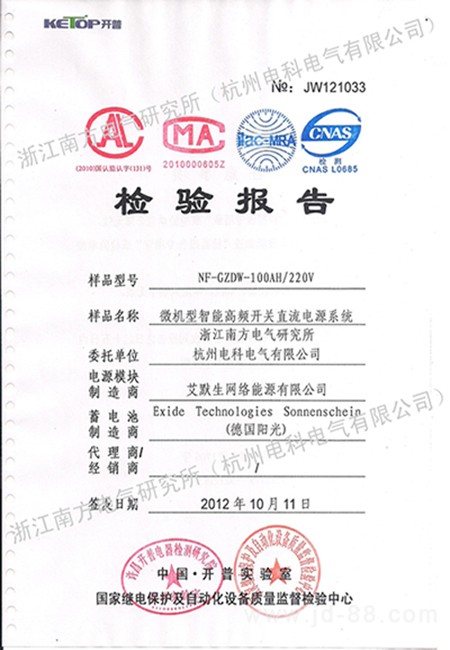 南方電科微機直流屏檢驗報告(德國陽光蓄電池+美國艾默生模塊)