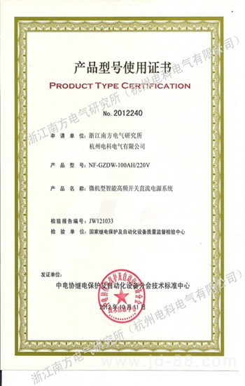 南方電科微機直流屏產(chǎn)品型號使用證書