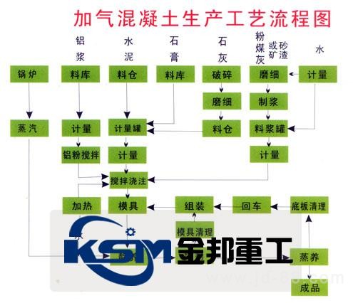 加氣混凝土設(shè)備首先將貯存的原材料經(jīng)計量配料(1)后進(jìn)入澆注攪拌機(jī)內(nèi),經(jīng)攪拌(2)均勻后澆注溫度和時間的預(yù)養(yǎng)(4)坯體達(dá)到一定硬度后,由翻轉(zhuǎn)吊具把模具和坯體吊至切割機(jī)上。翻轉(zhuǎn)吊具完成下列功能:a把模具在空中作90度翻轉(zhuǎn)(5)(模具的一側(cè)板成為支承坯體的底板直至蒸養(yǎng)出成品),b吊運(yùn)載小車或切割支撐架上完成開模、脫模(6),c脫下的??蚝头祷氐恼麴B(yǎng)側(cè)板(16)再重新組合成模具(17)等待清理后噴油(18)重新澆注。坯體在切割機(jī)上分步作六面切割;a首先進(jìn)行坯體兩側(cè)面垂直切割(7),b然后進(jìn)行縱向水平式切割(8);c最后進(jìn)行橫向水平式切割(9)。切割好的坯體由半成品吊具連同底板吊至蒸養(yǎng)小車(10),然后編入蒸壓釜(11)進(jìn)行高溫蒸養(yǎng)(12),蒸養(yǎng)好后出釜(13),由成品吊具將成品堆垛(14)或裝車、打包(15),蒸養(yǎng)側(cè)板則返回(16)。