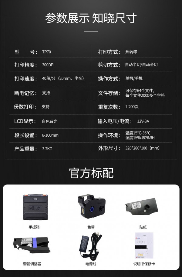 - 分辨率:180dpi x 360dpi,支持1-5號(hào)字體(根據(jù)套管尺寸調(diào)整)。