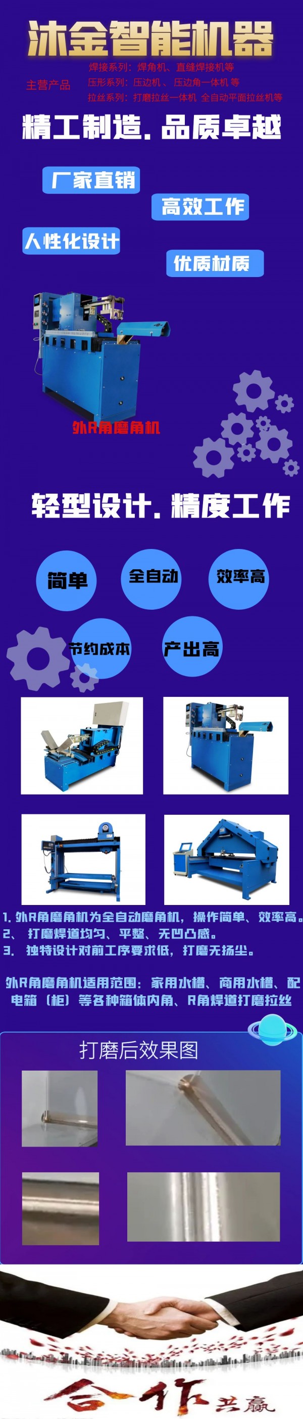 全自動(dòng)拉絲機(jī),拋光機(jī),自動(dòng)打磨機(jī);適合鋁板,銅板,鐵板,不銹鋼板等各種板材。星盆磨內(nèi)角機(jī),外角自動(dòng)打磨機(jī),側(cè)平面打磨機(jī),弧面產(chǎn)品自動(dòng)拉絲機(jī),自動(dòng)砂帶機(jī),異形產(chǎn)品半自動(dòng)打磨拉絲機(jī),三角砂帶機(jī)。