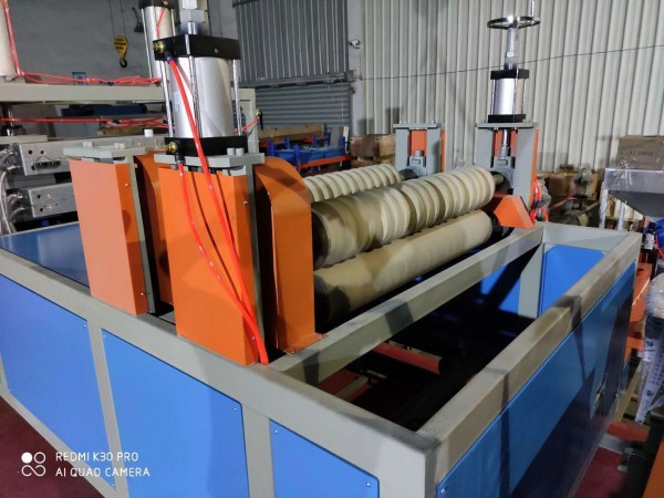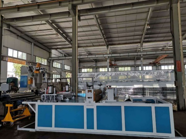 PVC中空雙層波浪瓦生產(chǎn)線:主要由彈簧上料機(jī)(主機(jī)配套用)、SJSZ80/156錐形雙螺桿擠出機(jī)、真空上料機(jī)(單螺桿主機(jī)配套用)、料斗干燥機(jī)(單螺桿主機(jī)配套用)、SJ50單螺桿擠出機(jī)、中空波浪瓦擠出模具、共擠分配器、中空波浪瓦成型模具、真空定型臺(tái)、瓦型橡膠牽引機(jī)、橫向切割機(jī)、不銹鋼滾輪式堆放架。輔機(jī)部分:高速混合機(jī)組、破碎機(jī)、磨粉機(jī)。
