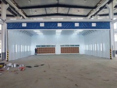 固定段為噴漆房主體部分,伸縮段較小,起調作用。固定段的一端安裝迷宮格干式處理噴漆漆霧,另一端有進風口,使噴漆房內的空氣產生定向流動,使噴漆房內保持空氣暢通。固定段和伸縮段都安裝有柔性大門。噴漆房整體移動時,柔性大門開啟,到噴漆工位后,關閉柔性大門,形成封閉噴漆房。
