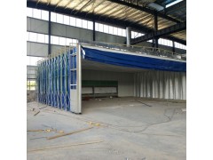 伸縮移動噴漆房整體為框架傳動結(jié)構(gòu),每組框架間均有阻燃PVC布密封連接,安裝快捷、外形美觀,結(jié)構(gòu)精巧,使用方便,制造成本低,節(jié)約!工作中房體沿地面鋪設(shè)的軌道前后伸縮移動,采用兩邊分別驅(qū)動,互相連鎖的方式運(yùn)行,前后安全限位控制,機(jī)械運(yùn)行安全穩(wěn)定,操作簡單,使用方便。工作區(qū)內(nèi)安裝有防爆照明燈,可滿足生產(chǎn)中的照明需要!可根據(jù)客戶的實(shí)際生產(chǎn)需要定做各種型號的非標(biāo)尺寸;在無需進(jìn)行噴漆流程的工作時(shí)間內(nèi),可將前室并攏,節(jié)省空間場地作為其他與噴漆交叉作業(yè)的工序所使用。