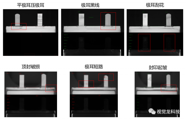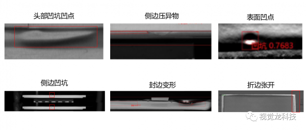 本項目檢測電芯外觀52種缺陷類型,120多種缺陷項。包含凸點、切邊不良、主體變形、角位變形、破損、脹氣、腐蝕、漏液、異色點、異物、鋁塑膜黑線、電解液、劃傷、極耳短路、頂封短路、極耳黑線、極耳斷裂、極片翻折、鋁箔翻折等缺陷。致命不良(零漏檢)缺陷包含破損、脹氣、切邊不良、角位變形、極耳短路、主體變形、極片翻折、雙極耳、無極耳膠、邊電壓刺破、封印封斜、封印壓異物、封印起皺、壓極耳、脹氣、主體內(nèi)異物等。