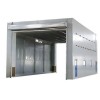 整體移動式噴漆房主要應(yīng)用于大型工件的打磨或噴漆工作中,方便收集工作中產(chǎn)生的粉塵或廢氣。在一般情況下每套房體設(shè)設(shè)置有2-3個排風(fēng)凈化工位,哪個工位上的工件需要噴漆時(shí),房體則行走移動到那個工位,其他工位可以繼續(xù)打磨工作,待房體內(nèi)的工件噴漆完畢后,再控制移動房體行走到打磨完畢的工件工位,如此設(shè)計(jì)可以實(shí)現(xiàn)大型工件的不間斷連續(xù)噴漆工作。房體為鋼結(jié)構(gòu)構(gòu)造,房體立柱下面設(shè)置有兩臺電動驅(qū)動行走機(jī)構(gòu),行走機(jī)構(gòu)沿地面軌道行走。移動房體兩端設(shè)置有電動卷簾大門,房體行走時(shí),大門升起,待到達(dá)指定位置時(shí),大門降落關(guān)閉。大門與行走機(jī)構(gòu)由電氣控制部分連鎖控制,大門完全升起后,房體才可移動行走。 一種是側(cè)進(jìn)風(fēng)(或房頂部)、側(cè)排風(fēng)。這種排風(fēng)設(shè)計(jì)管道在房體之外,長度與整體移動房體的大行程相同。外側(cè)排風(fēng)管道上設(shè)若干個電動風(fēng)閥,而在房體側(cè)面設(shè)置若干個噴漆或打磨工位,并在此處通過伸縮汽缸實(shí)現(xiàn)與排風(fēng)管道的自動對接。漆霧收集采用玻纖地棉過濾,過濾棉框嵌入噴漆房墻體的排風(fēng)一側(cè),而另一側(cè)墻體或者房頂設(shè)置進(jìn)風(fēng)過濾系統(tǒng)。另外一種排風(fēng)方式是上進(jìn)風(fēng)、下排風(fēng)。這種設(shè)計(jì)為地溝排風(fēng),漆霧廢氣通過地溝引向漆霧處理器,干式或者濕式漆霧處理設(shè)備都可以。漆霧處理器可設(shè)置在不影響其他工作的任意位置。主體地溝的長度應(yīng)與房體的行程相同,地溝上面封閉,可設(shè)置電動風(fēng)閥,按照工作的實(shí)際情況打開或關(guān)閉風(fēng)閥。也可以排風(fēng)口上面設(shè)置格柵,并設(shè)有密封門,房體行走到那個工位,就把對應(yīng)的排風(fēng)口打開。采用地溝方式排風(fēng),進(jìn)風(fēng)過濾系統(tǒng)設(shè)置在房頂。